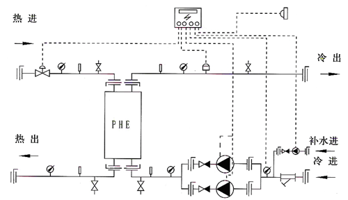 全自動(dòng)無人值守現(xiàn)場控制換熱機(jī)組,具有手動(dòng)控制換熱機(jī)組功能外,一次網(wǎng)配有電動(dòng)調(diào)節(jié)閥,控制二次網(wǎng)的供水溫度,具有室外溫度補(bǔ)償功能,循環(huán)泵采用變頻控制,利用二次網(wǎng)供回水壓差作為反饋信號(hào),二次網(wǎng)進(jìn)行變量控制,不水泵采用變頻補(bǔ)水,根據(jù)二次網(wǎng)回水壓差作為反饋信號(hào)。所有水泵,電動(dòng)調(diào)節(jié)閥,二次網(wǎng)供水溫度等均由控制器來完成全自動(dòng)控制,并且控制器能夠控制程序來自動(dòng)完成機(jī)組的啟停及復(fù)電后重新啟動(dòng),一個(gè)水箱水位傳感器接入控制器自動(dòng)控制水箱水位。而且具有缺水保護(hù)不水泵功能;二次網(wǎng)回水管線加裝卸壓裝置,正常情況下,該機(jī)組處于無人值守自動(dòng)運(yùn)行狀態(tài),只需工作人員定期進(jìn)行巡查。